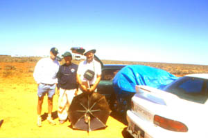 We arrive at 11:30, Central Australian Summer Time (10.5 hours ahead of Greenwich: South Australia and Northern Territory do the same as Newfoundland - make it a half hour difference). Already cars have pulled off the road as far as the eye can see, and it's over seven hours before first contact. One group is constructing scaffolding to view from a hight. As the afternoon progresses, I walk about, finding out where people are from, and getting them to sign my log book. People are from all over the world. Besides Australia, I meet people from Spain, Germany, Switzerland, Italy, and the USA. Although I didn't meet anyone else from Canada, some told me they saw a group flying the Canadian flag about two kilometres down the road. As I had already started my regular eclipse observation program of making temperature observations when I heard about the other Canadians, I couldn't search for them. Okay: who else from the RASC came that I don't know about?