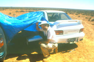 As we cross the south-eastern limit of the path of totality, there is a sign indicating the eclipse path. Driving closer to the central line, we notice people pulling over and setting up. We drive by the Wirraminna rail siding then pull over about five kilometres past it, only about 100 metres east of where we figured the central line passes. This is the true outback. Sand and bushes as far as the eye can see. One would be hard pressed to find a bush over 20 centimetres high. The car is driven about 20 metres off the road, into a clear patch of sand, We selected this spot because the clump of bushes immediately to the west would not be a suitable spot for someone to set up in our line of site to the eclipse