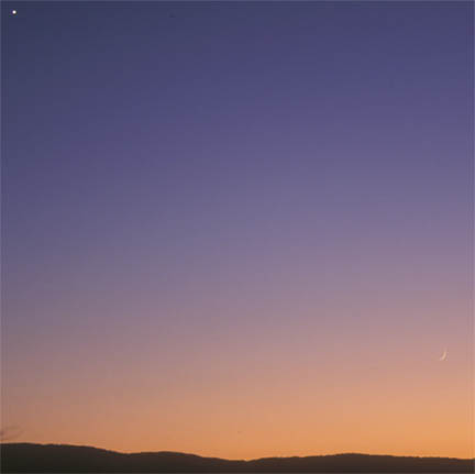 Early morning, on the day before the eclipse, the thin cresent moon was rising over the hills, as seen from the home of Robert Price, in Bethanga, Victoria, just before we left for the eclipse site. The planet Venus is in the upper left. |