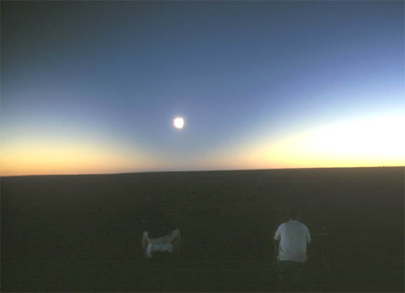 Some people start packing up and leave soon after totality. I guess the partial phase is considered an anti-climax after totality. But we continue to observe. The partial eclipse is still in progress at sunset (20:16). I decide to try photographing the partially eclipsed sun on the horizon, assuming it would be dim enough to photograph at that time without filter. Wrong. It was still very bright as the lower limb of the eclipsed sun touched the horizon, and needed my #14 welders glass to look at it even then. I wait as the partially eclipse sun sinks lower. Just before the last bit of sunlight disappears below the horizon, I look at it through my camera set at 200mm. Within seconds I see the green flash -- am caught totally by surprise -- then press the shutter button just after the green flash disappears. This was my eleventh eclipse but was my first green flash. Shortly after sunset, we pack up and start the drive back to our hotel at Wilmington. This is probably the first time there has been a traffic jam in the outback of Australia. We pull into Spud's Roadhouse at Pimba. There was a long queue for petrol. We pass on getting petrol and go inside and order something to eat. After we manage to place an order for something light and easy to make, we wait an hour before our order was called. We get to the outskirts of Port Augusta as the low fuel warning light comes on, and just make it to an open service station. Reaching the Wilmington hotel about 01:00, Robert and David quickly settle into bed while I go out to the one public phone it town and call home to let folks know what happened. After I finish the phone call, I spend a few minutes admiring the southern sky, before returning to the hotel and bed.