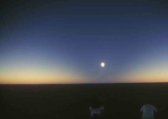 Wide angle photo (28mm) of totally eclipsed sun, showing shadow of the moon on earth. The light areas on each side represents the atosphere outside of the total eclipse. The photograph below was taken a few seconds later. |
