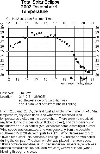 My setup for making temperature recordings was aided by others. Two cars were set up side-by-side, with a tarpaulin between them. I tied my thermometer to an umbrella under the tarpaulin and with the wind blowing through this setup, ensured the thermometer was well ventilated. Accuracy of reading wasn't the goal, only relative change in temperature. We were fortunate this was not a hot day, for we had no shade, except from the cars around us. During the day, the highest temperature was 29.0 degrees at 14:30 Central Summer Time. The temperature slowly dropped to 26.2 just before first contact. It would be normal for temperature to drop during this time of day. As the eclipse progressed, the temperature continued to drop to 21.6 until just after totality at 19:41. Then it levelled off, remaining at that temperature until 20:00, when it continued the drop, reaching 20.8 degrees at sunset at 20:16 and 20.5 degrees at the last observation at 20:35.