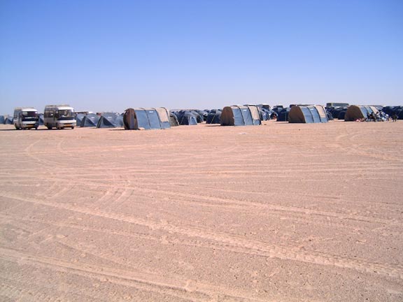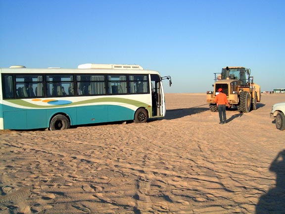 Our bus arrived -- almost! Needed a tow out of sand 100 metres