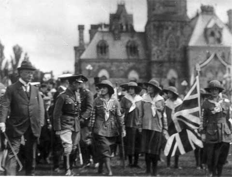 Tot, in Girl Guide uniform, escorting the Prince of Wales on Parliament